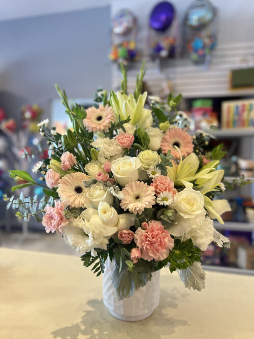 Las imágenes son ilustrativas, el arreglo puede tener alguna variación por la disponibilidad de las flores o follajes o inclusive en el tipo de base, en cuyo caso se sustituirán por otra de igual o mayor precio, respetando en la medida de lo posible el diseño original solicitado por nuestros clientes.